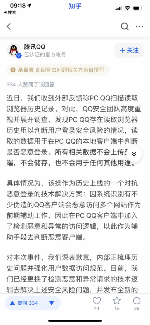 火绒安全实验室对此解释称,腾讯QQ/Tim会获取用户浏览器(Chrome、IE以及其它Chromium内核浏览器)的历史访问记录,在读取后会根据数据对信息情况进行分类。腾讯QQ/Tim会使用MD5比较历史记...