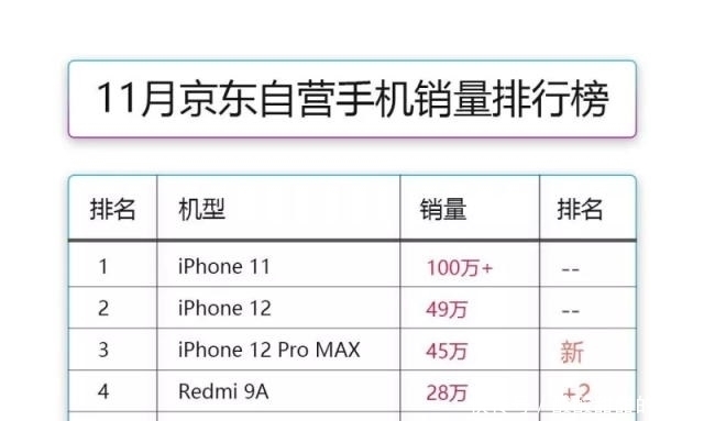 近日,11月京东自营手机销量排行榜被公布,苹果包揽前三甲,其中iPhone 11凭借极高的性价比以及100多万的销量成绩依旧稳居榜首。而最新上市的iPhone 12则以49万的销量拿下第二,超大杯...