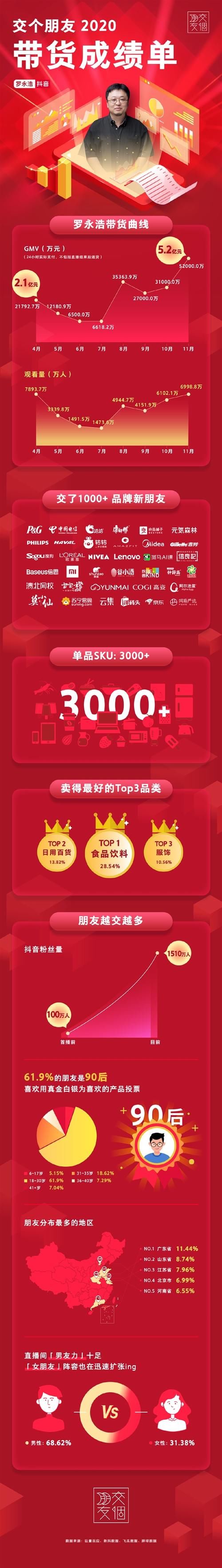 老罗的抖音粉丝数也由首播前的100万人,一路飙升至1510万人。数据显示,61.9%的朋友是90后,喜欢用真金白银为喜欢的产品投票。 朋友分布最多的地区为:广东(11.44%)、山东(8.74%)、...