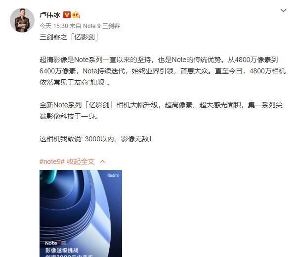 据传,该款手机的后置将会采用四摄的设计,并全球首发三星的一亿像素 HM2 传感器,为了证实自己所表述的“3000元以内,影像无敌!”卢伟冰在首条图文发布后,紧接着又发了一条跟...