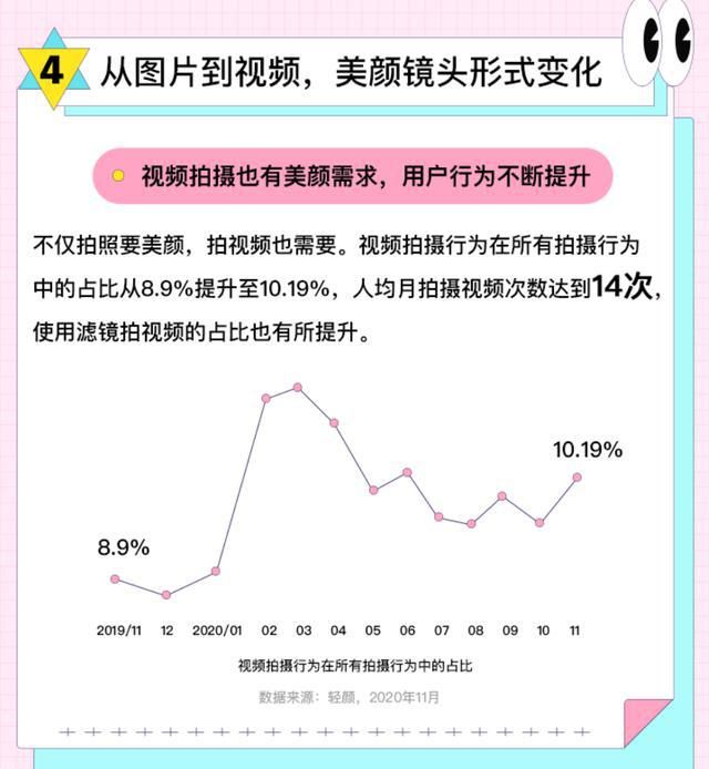不难看出拍视频带滤镜占比的提升是随着视频拍摄行为占比同步提升的。其中原因不乏有现在是视频社会化元年,几大短视频平台的爆火,也带动了一批人转向短视频内容的拍摄。随着...