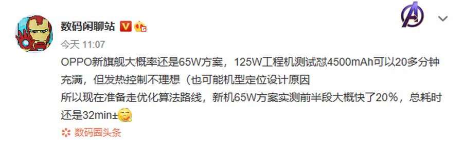 【 旗舰|OPPO新一代旗舰充电速度曝光,优化65W充电 】12月9日,今日,有数码博主@数码闲聊站曝光了OPPO正在开发的新一代旗舰手机新内容,据爆料称OPPO的新一代旗舰可能还会使用65W充电...